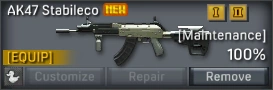 | “ | [AK47 Stabileco] A custom AK47 with improved stability and auto-fire. These modifications give it slightly less firepower. | ” |