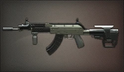 The AK47 Stabileco is an automatic assault rifle used by rifle men, and is available for permanent purchase in the in-game shop for 300 red tickets by soldiers of any rank. It is an upgraded model and custom variant of the AK-47, featuring a black and beige-grey exterior with alterations to the physical design, including a larger stock and different sight and barrel design.
