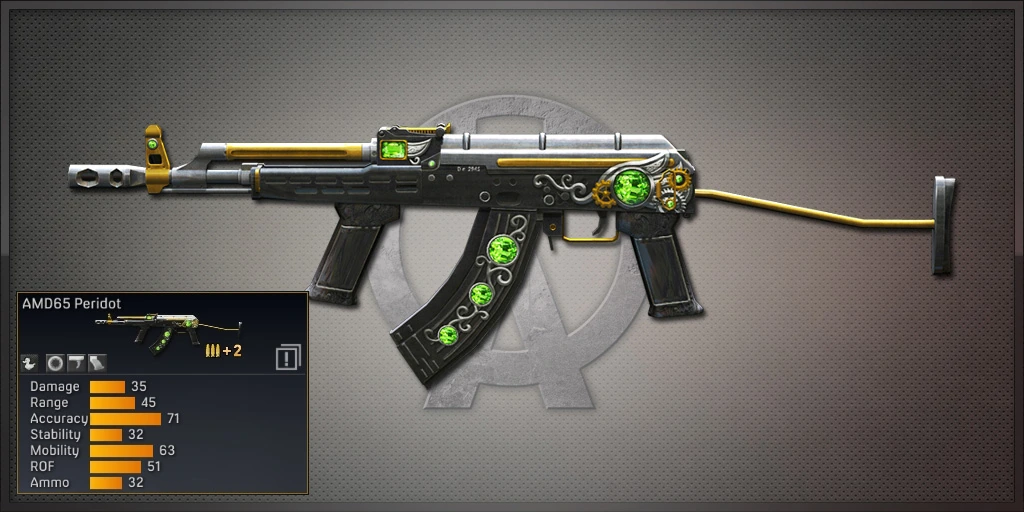 The AMD65 Peridot is a skinned variant of the AMD65. It was originally released as a possible prize from the Jewellery Box in the Capsule Shop, along with the Veresk Sapphire and DSR-1 Amethyst. Statistically and performance-wise, it is identical to the AMD65 (with +2 bullets per magazine).