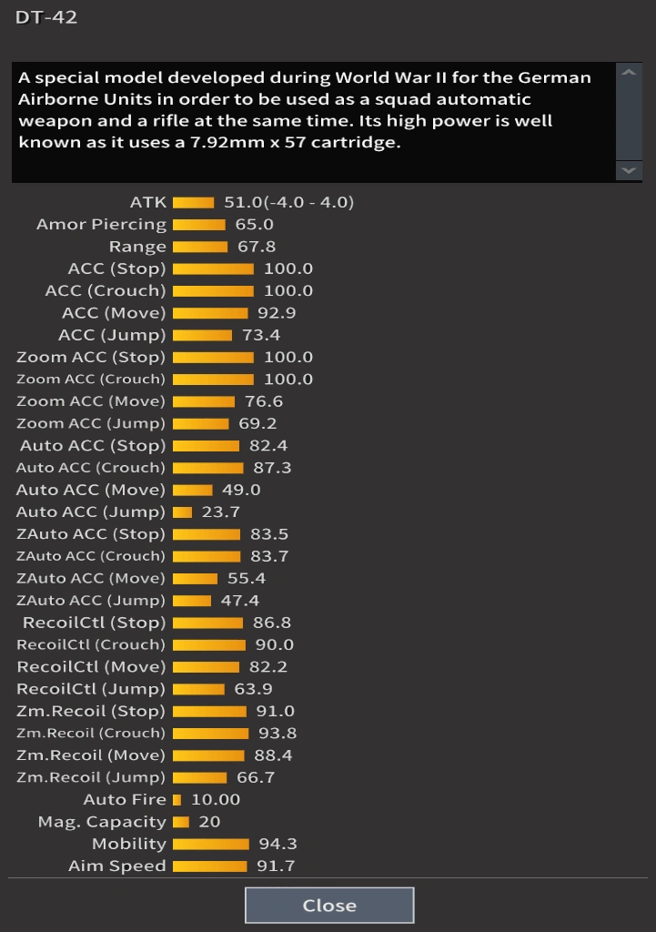 The FG42 has very high damage due to the type of round it uses, but as a result, its stability suffers. It is strange to note that it is one of the most accurate weapons in the game. This along with its rather slow rate of fire should help a player land most of their shots. It is considered by many the best assault rifle in the game, due to its very high damage and almost non-existant recoil when crouched ou when tapping, it also has very good headshot abilities due to its high range, making it a one shot to kill to the head up to 20 meters. Many players seem to dislike the horizontal magazine and often overlook it by that reason.