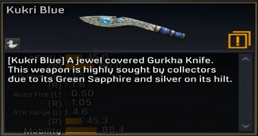 | “ | A jewel covered Gurkha knife. This weapon is highly sought by collectors due to it's Green Sapphire and silver on its hilt. | ” |