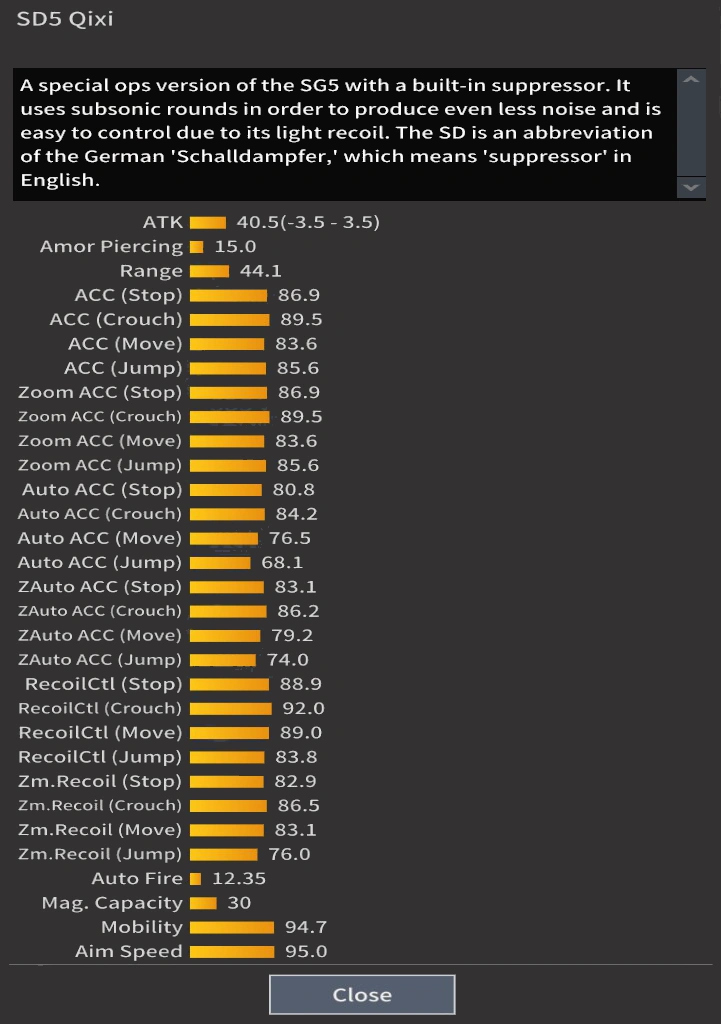 The SD5 Qixi is a Sub Machine Gun first introduced during 25-8-22 Release Update. It possesses excellent ROF and average damage, giving it a remarkably high DPS. It also has an integrated silencer, making it useful for flanking. It has occasionally problematic bloom which may be cured by using the Spetsnaz barrel. Alternatively, when shot in 4-5 shot bursts, the MP5SD loses almost all its bloom, making the Burst Barrel the more useful attachment as it makes the gun overall more deadly. This is highly recommended, and makes the MP5SD5 one of the most effective burst weapons in the game (especialy when combined with a Silicon Grip).