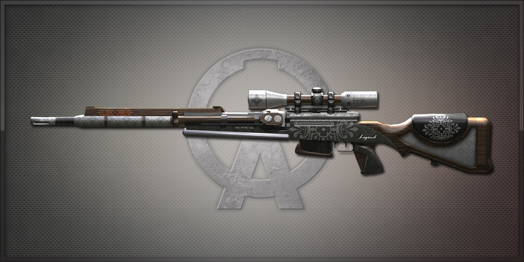 The SR-F2 Legend is a bolt-action sniper rifle used by snipers, and was available through the Unique Soldier Box. It is an upgraded model and custom variant of the SR-F2 (FR-F2), featuring light brown and silver filigree paintwork across the body, with updated textures across the exterior resembling an oaken stock and barrel.